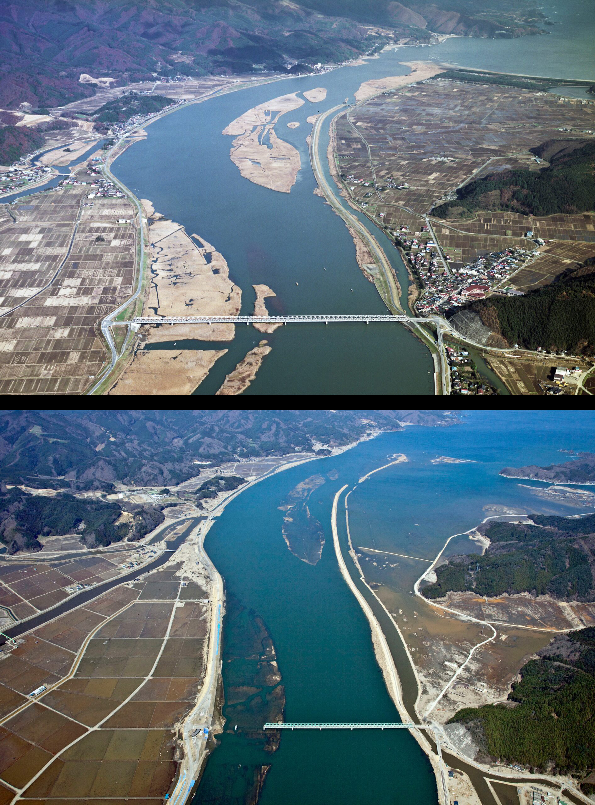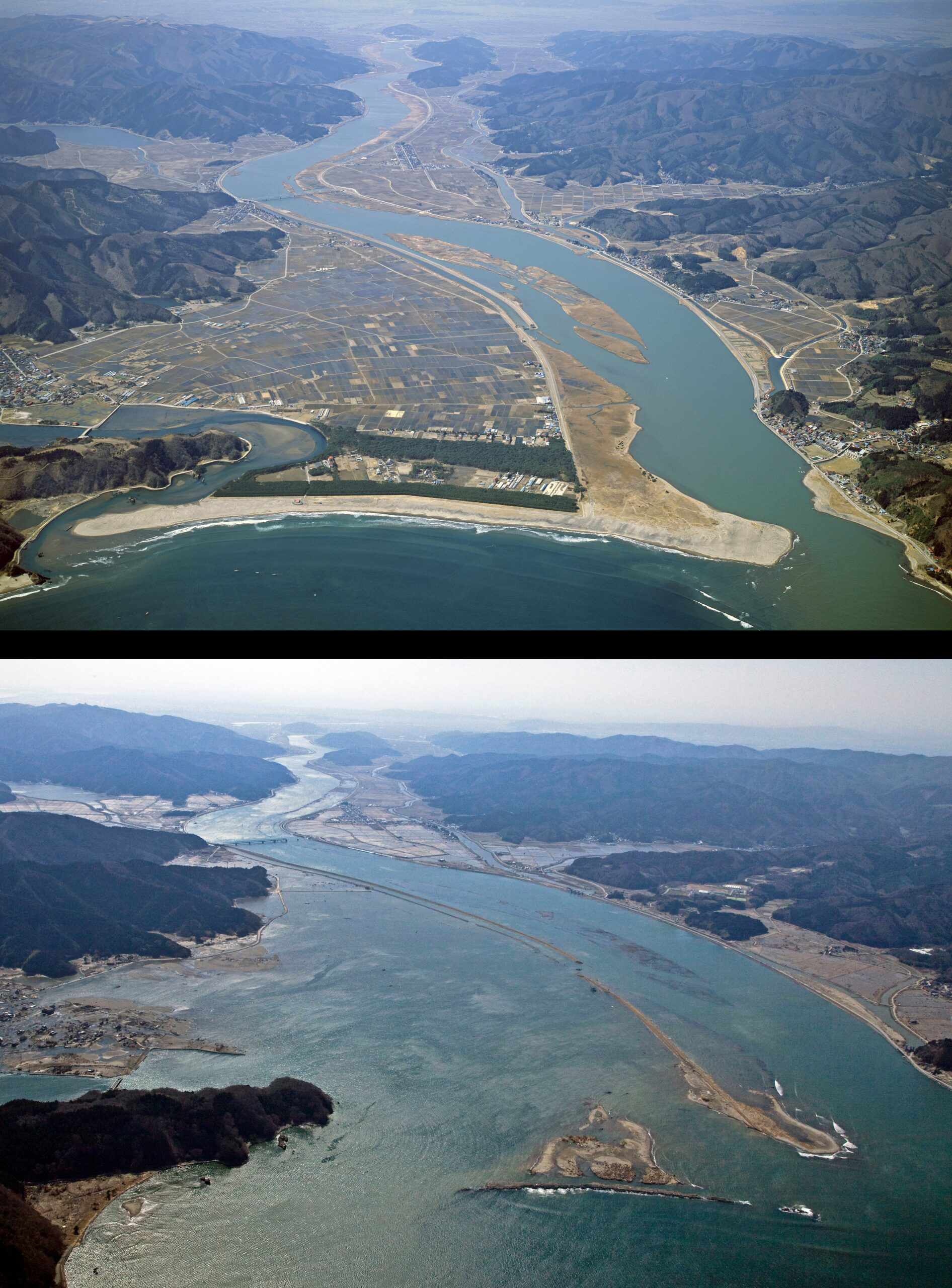 河口付近の松林は、地震による地盤沈下と津波で流失。林野庁などによると現在、根が深く張れるよう盛り土をして松林の再生を進めている。